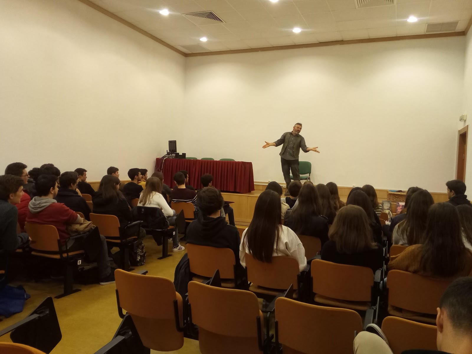 Esta manhã, no auditório da biblioteca escolar da escola secundária de Alcochete, o contador de histórias Rodolfo Castro, que se autointitula ironicamente o "pior contador de histórias do mundo" veio surpreender alunos do 12º ano, turmas A, B, C e F, com histórias improváveis, cheias de humor negro e de ironia.