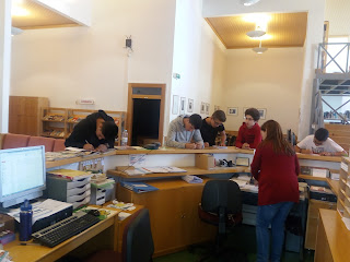 É um prazer ver os alunos distribuírem-se em pequenos grupos pela biblioteca, quer em volta das mesas, quer frente às estantes quer nos computadores. Sempre empenhados e calmos, sem prejudicar em os restantes utentes da biblioteca.