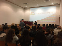 Por fim, os alunos dirigem-se ao auditório, onde, em conversa com a professora bibliotecária, abordam outros assuntos práticos, como o modo de pesquisar para os trabalhos escolares e a importância de verificar a veracidade das informações que utilizam e difundem.